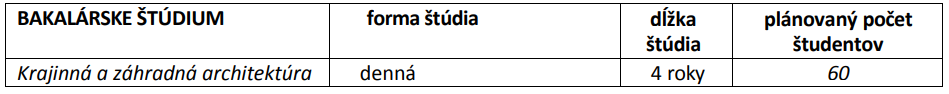 Bakalársky študijný program krajinná a záhradná architektúra ponúka znalosti humanitných disciplín a základov tvorivých procesov. Absolvent má poznatky z oblasti prírodných a technických vied, náuky o krajine, výtvarno-estetických a konštrukčno-stavebných predmetov. Ovláda históriu, teóriu a nástroje záhradnej a krajinnej tvorby, pozná sortiment rastlín využiteľných v záhradnej a krajinársko-architektonickej tvorbe, ako aj technológie realizácie výsadieb. Získa znalosti z oblasti informačných technológií a aplikovanej počítačovej grafiky a z oblasti zakladania a údržby zelene.